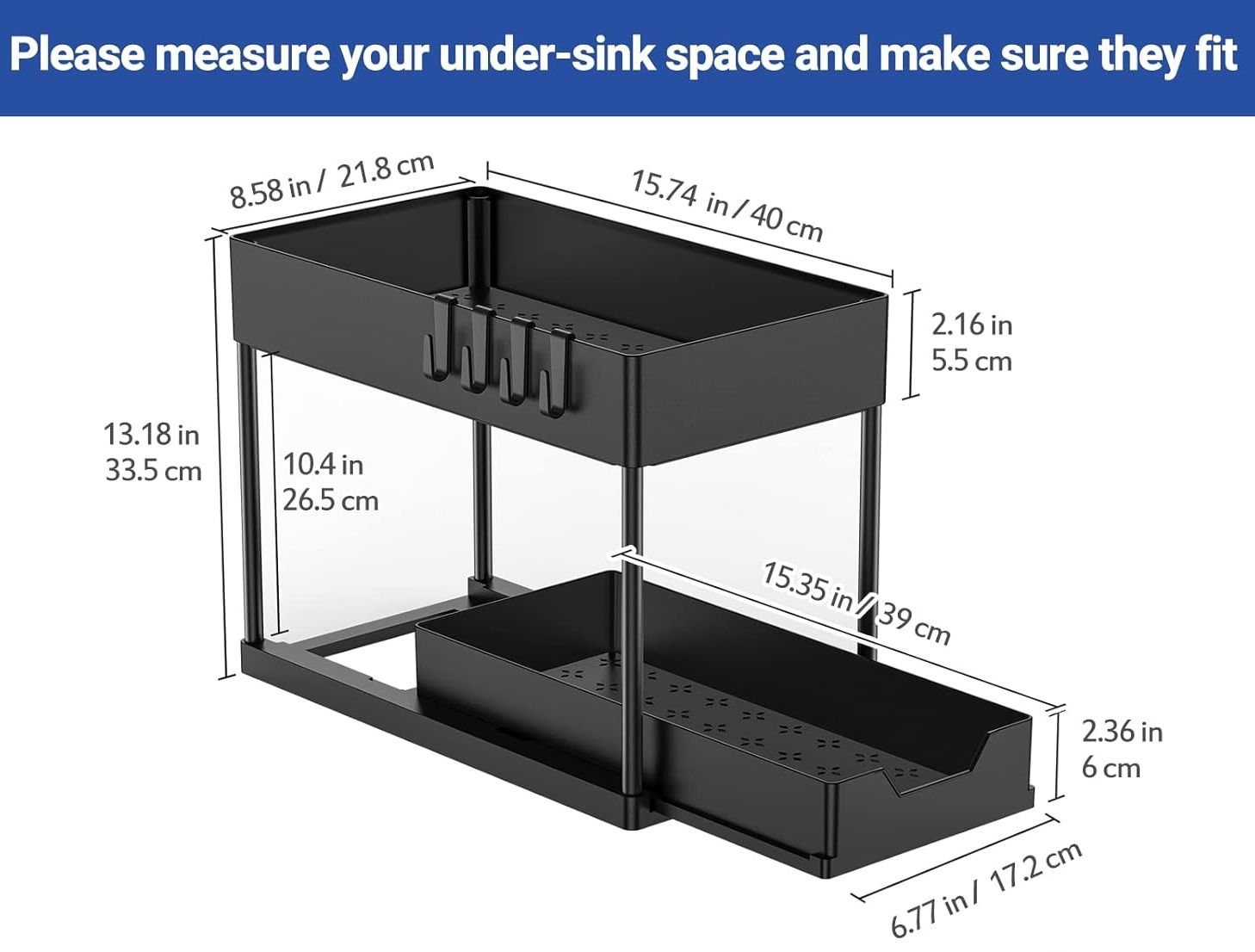 CARLA HOME 2 Pack Under Sink Organizer with Pull-Out Basket and Hooks for Bathroom & Kitchen