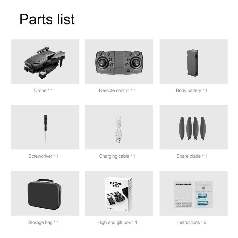 The F198 Dual-Camera Drone is designed for beginners and hobbyists looking to capture high-quality aerial footage with ease. Refer to the image for exact dimensions before purchase. Equipped with a 4K HD camera, brushless motors, and a lightweight foldable body, this drone provides smooth flight performance and impressive video clarity. With a flight time of about 11–12 minutes and a control range of up to 100 meters, itâ€s ideal for outdoor exploration, creative filming, and recreational flying.