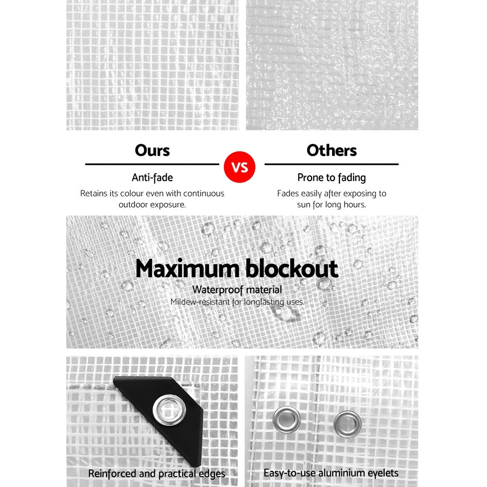 Are you tired of having the bottom of your tent always wet with every camping trip? Or does the rain rot your firewood? Or do you need some reliable cover for your vehicle or craft? Or maybe just a little shade for yourself. Look no further than our Instahut Poly Tarp. Made of high-density 135gsm polyethylene (PE) with a double-coated protection, the tarp is durable, waterproof, anti-fade, UV-resistant, high heat and deep cold tolerant and designed with reinforced edges and corners. Better still, it comes with reinforced eyelets spaced out at 0.9m intervals to ensure secured tie-downs without any hassles. Come wind, rain, hail or shine, our tarp knows no boundaries in getting the work done to your satisfaction.